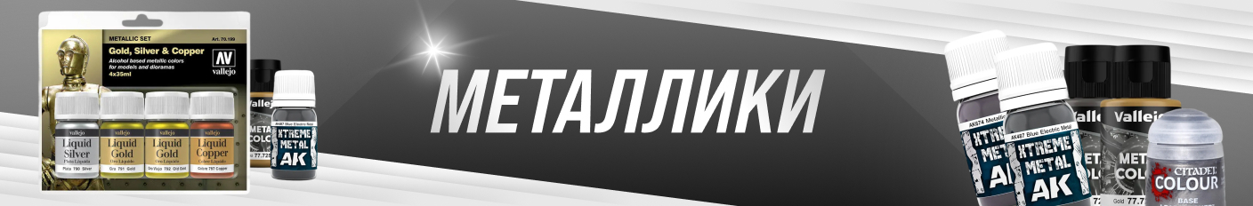 Если вы ищете Vallejo Metal Color купить, металлические краски Vallejo, краски металлик для миниатюр или металлики Vallejo для Warhammer, в этом разделе вы найдёте все основные оттенки серии для покраски игровых и витринных моделей.