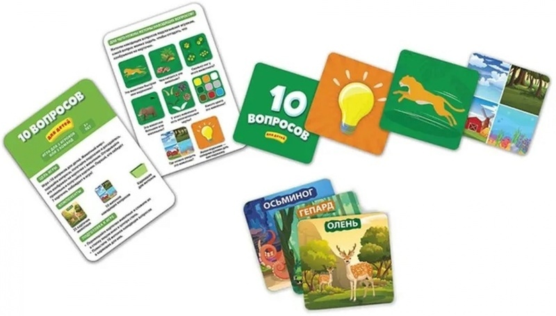 В игре вы найдёте 35 игровых карточек с красочными иллюстрациями самых разных животных: зверей, птиц и насекомых. Рекомендуемые вопросы представлены на специальных жетонах в виде картинок-подсказок, чтобы на первых порах ребёнку было легче ориентироваться. Как только он освоится — сможет и сам задавать любые интересующие вопросы.