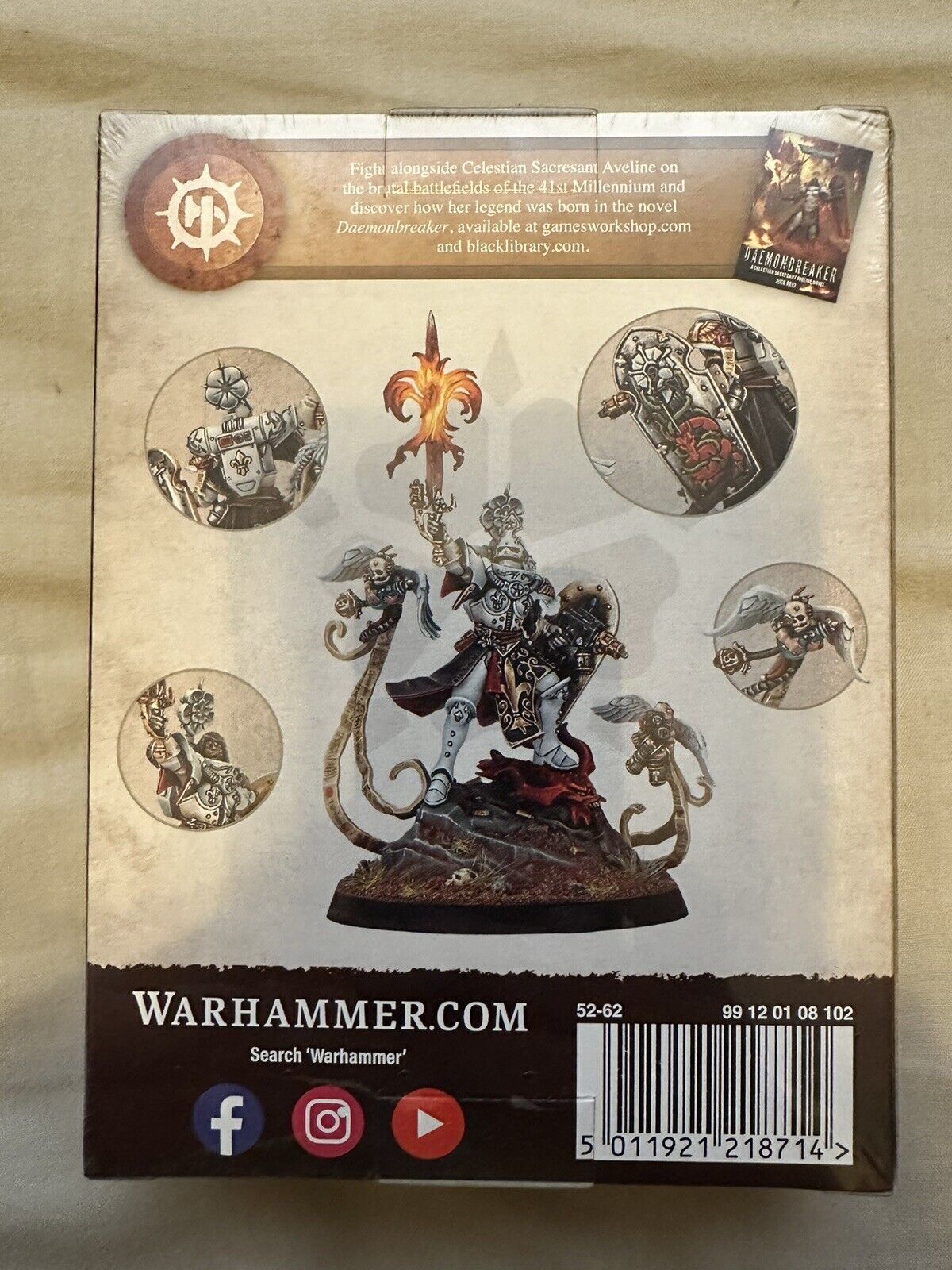 Из этого набора можно собрать Целестианскую Сакрезантку Авелину, персонажа из романа Daemonbreaker, которая поведёт ваши силы Адепта Сороритас к победе. Вы можете собрать её как в шлеме, так и без него, а миниатюра устанавливается на впечатляющую диорамную подставку. Этот набор станет потрясающим центральным элементом любой коллекции, и его детали порадуют художников.