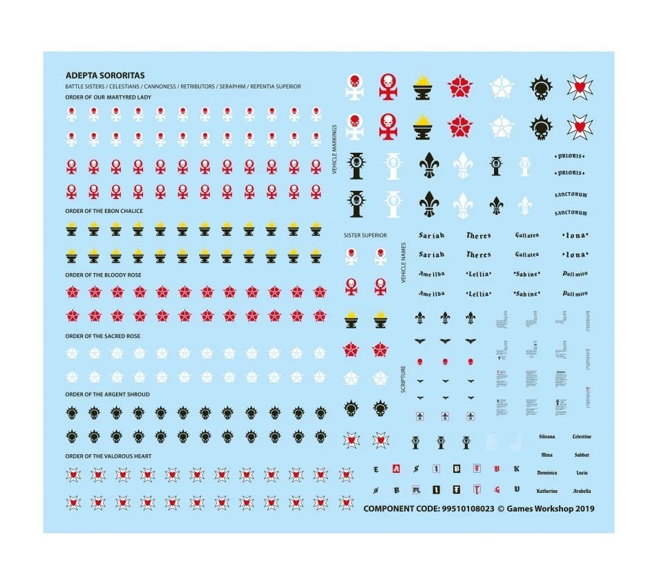 Набор «Adepta Sororitas Retributor Squad» состоит из 115 пластиковых деталей, пяти 32мм подставок и двух 25мм подставок, из которых можно собрать пять Сестёр Битвы и двух Херувимов.