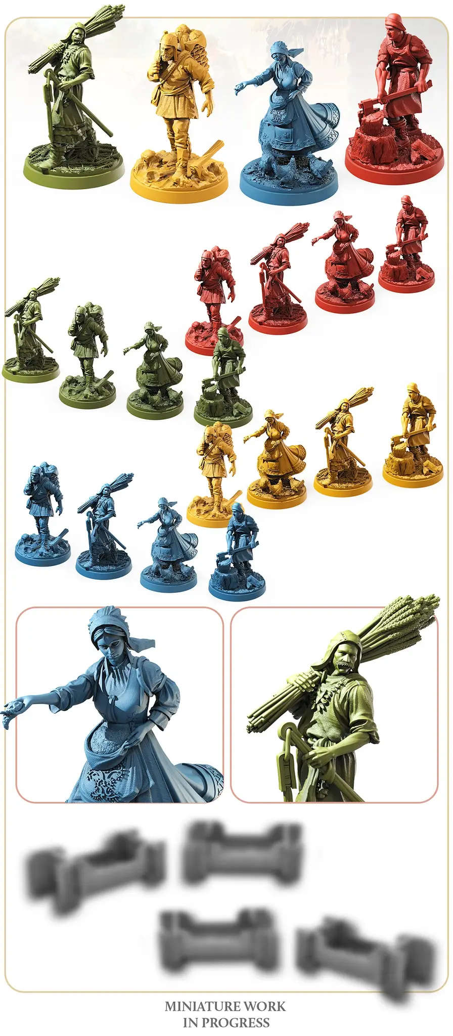 Набор детализированных пластиковых миниатюр, заменяющих стандартные жетоны семьи в игре Agricola. Подходит для игры от 1 до 4 игроков и придаёт партиям больше объёма и атмосферы.