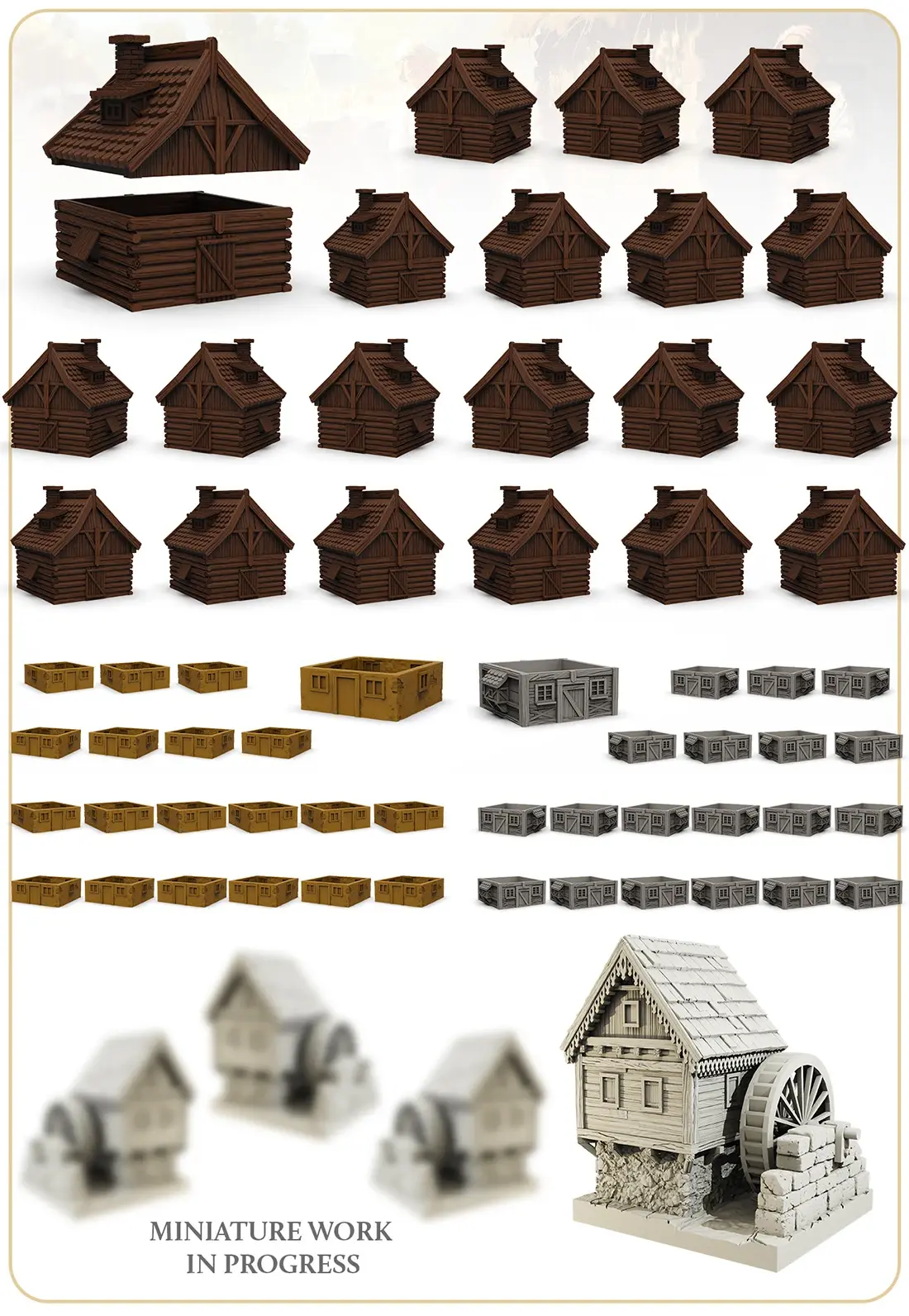 Косметическое дополнение с детализированными пластиковыми миниатюрами построек для Agricola, которое заменяет стандартные жетоны домов и мельниц. Эти компоненты придают фермам выразительный объём и делают игровое поле ещё более атмосферным.