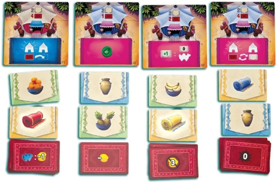 Ковры: Эти карты бывают шести цветов, и за раз вы не можете продать больше одной карты одинакового цвета. И снова, чем больше вы продали, тем выгоднее.