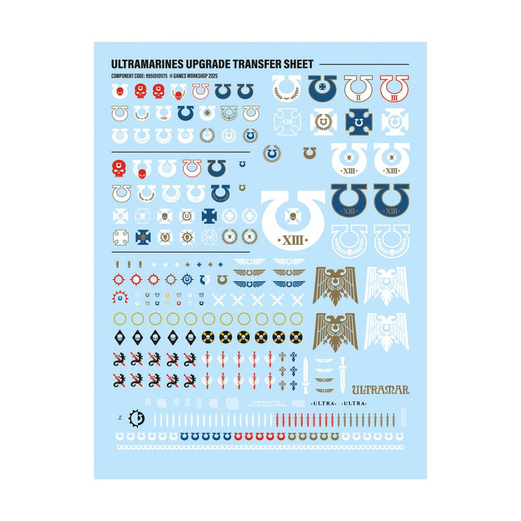 В комплект также входит новый лист декалей Ultramarines Upgrade Transfer Sheet с 255 водными переводными изображениями высокого качества. На нём представлены символы ордена Ultramarines, тактические обозначения, знаки кампаний, номера, почётные маркировки, а также крупные декали для техники.