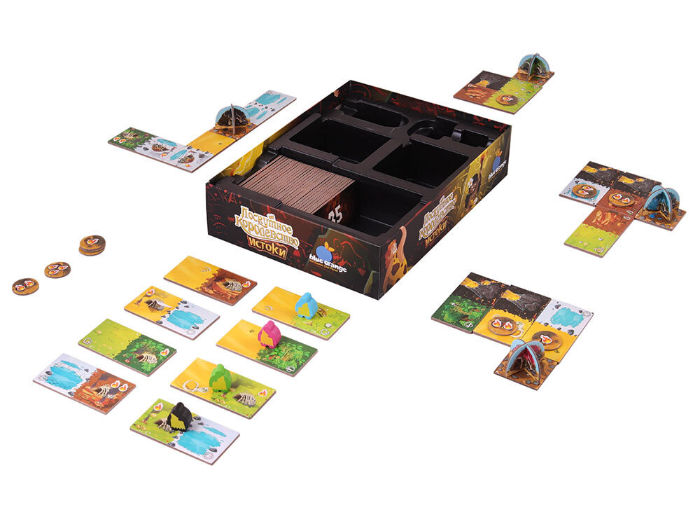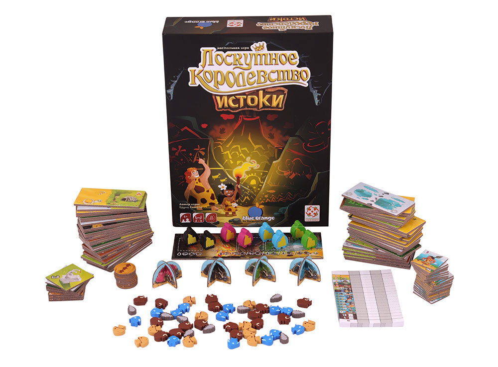 В состав настольной игры «Лоскутное королевство: Истоки» входят: 4 стартовых участка; 4 хижины (1 розовая, 1 жёлтая, 1 зелёная, 1 синяя); 8 деревянных фишек вождей племени (2 розовых, 2 жёлтых, 2 зелёных, 2 синих); 48 двусторонних прямоугольных участков (на одной стороне — ландшафт, на другой — число); 1 планшет пещеры; 22 тайла кроманьонцев; 4 тайла тотемов (мамонт, рыба, гриб, кремень); 49 деревянных фишек ресурсов (16 мамонтов, 13 рыб, 11 грибов, 9 кремней); 10 жетонов костра: 5 жетонов с одним костром, 4 — с двумя кострами, 1 — с тремя кострами; 1 блокнот для подсчёта очков; правила игры.