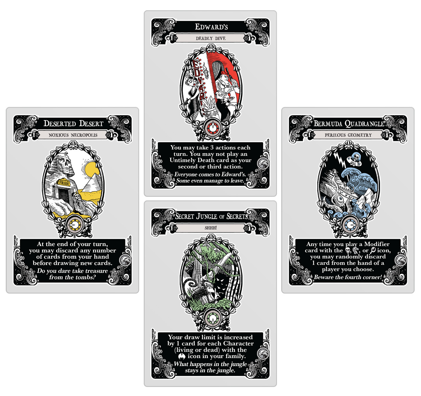Unfortunate Expeditions вводит в игру механику экспедиций. В любой момент времени в игре может находиться только одна экспедиция. Её правила действуют на всех игроков. Когда вы разыгрываете модификатор или преждевременную смерть, на которой есть символ экспедиции, примените незамедлительные эффекты этой карты, затем замените ею текущую экспедицию. У некоторых карт есть дополнительный эффект, срабатывающий, если на момент розыгрыша такой карты в игре находится соответствующая экспедиция.