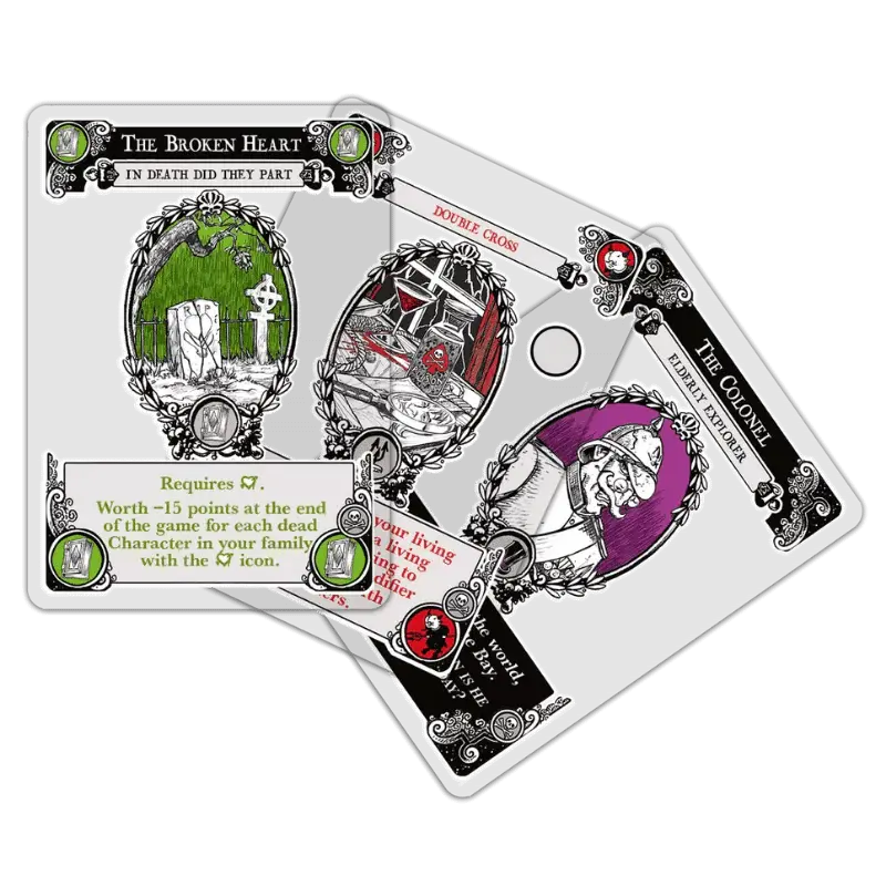 Gloomier использует прозрачные карты, что позволяет истории персонажа - и его очкам - развиваться по мере наложения карт друг на друга. Засчитывается только та информация, которая видна в данный момент. Карты модификаторов рассказывают о трагических событиях и дают персонажам отрицательные очки. Карты несвоевременной смерти заканчивают печальную историю персонажа. Вы побеждаете, если ваша семья окажется самой несчастной, когда вся она будет уничтожена.