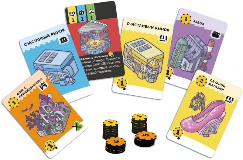 Для этого игроки в настольной игре «Город счастья» получают доход и тратят его на приобретение карт зданий с общего рынка. Впрочем, с рынка карты можно и сбрасывать – например, если вам какая-то карта совсем не нужна, или – что более интересно – если очень нужна вашему оппоненту.