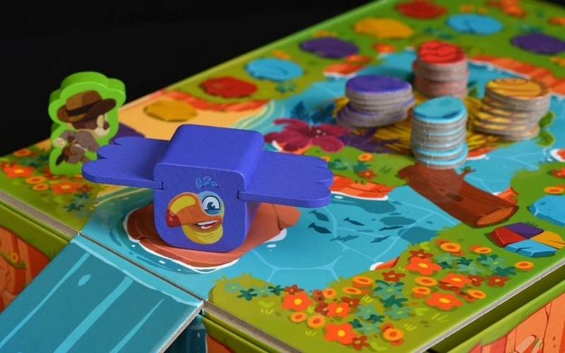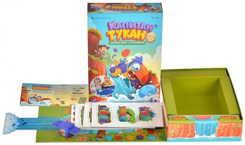 "Капитан Тукан" – это простая и увлекательная настольная игра для детей на ловкость и аккуратность. Задача игроков – спрятать все яйца семи туканов в кустах у подножия водопада. Каждый ход кладите один жетон яйца на фигурку тукана и аккуратно подталкивайте его, чтобы он скатился вниз по водопаду. Если яйцо осталось у тукана, скорее прячьте его в укрытии! А если упало и разбилось – охотник становится на шаг ближе к гнезду.