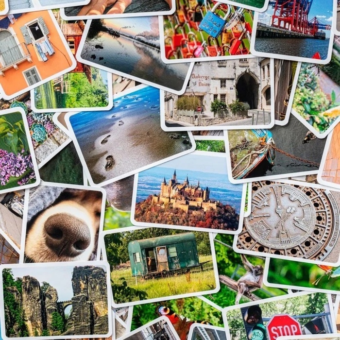 В каждом раунде участников ждёт новая картинка, набор компонентов от соседа слева и неповторимые эмоции. Игра поворачивается к вам другой стороной с каждой новой партией или компанией игроков, обещая море разнообразия и творческого вдохновения. Карточки, которые вам предстоит объяснять художественным языком необычных настольных предметов, чаще всего изображают умиротворяющие пейзажи, архитектурные сооружения и милые вещицы. Как будто кто-то отправляет вам почтовые открытки со всего света или делает фотографии на память. Вы не встретите здесь текста, конкретных узнаваемых сюжетов и сложных композиций — это почти абстракция из прекрасного мира, который нас окружает. Что ж, тем сложнее и интереснее будет пытаться воплотить выпавшую вам случайным образом картинку с помощью имеющихся предметов.