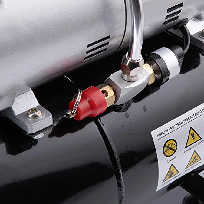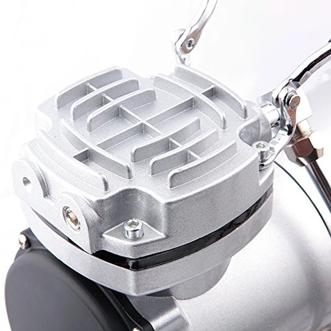 Безмасляный мини-компрессор с воздушным резервуаром (ресивером). Оснащён регулятором давления с фильтром и манометром. Отличается низким уровнем шума, малым весом и удобством переноски, подходит для использования дома и в хобби. Совместим с аэрографами с соплами 0,2–1 мм.