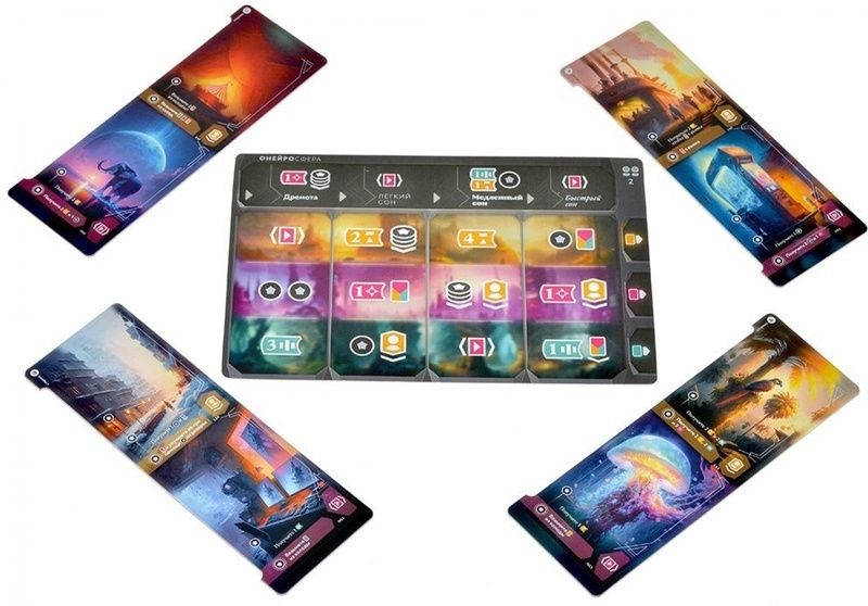 Чтобы создать прибыльное сновидение, вам потребуются ресурсы, а для их получения вы будете размещать на поле особых специалистов – онейронавтов. За это действие в игре отвечает уникальная механика. Всё зависит от ваших планов и доступных карт на рынке. В каждой партии вам предстоит заново придумать хитрый рабочий механизм, чтобы победить. Ресурсы же требуются для розыгрыша карт снов, с помощью которых вы и будете творить сладкие грёзы для клиентов компании. А чтобы эффект снов становился сильнее и круче, старайтесь заполнять их ключевыми образами. Привлекайте новую аудиторию, копите состояние и покажите конкурентам, кто на этом рынке настоящий профессионал. Сон в руку!