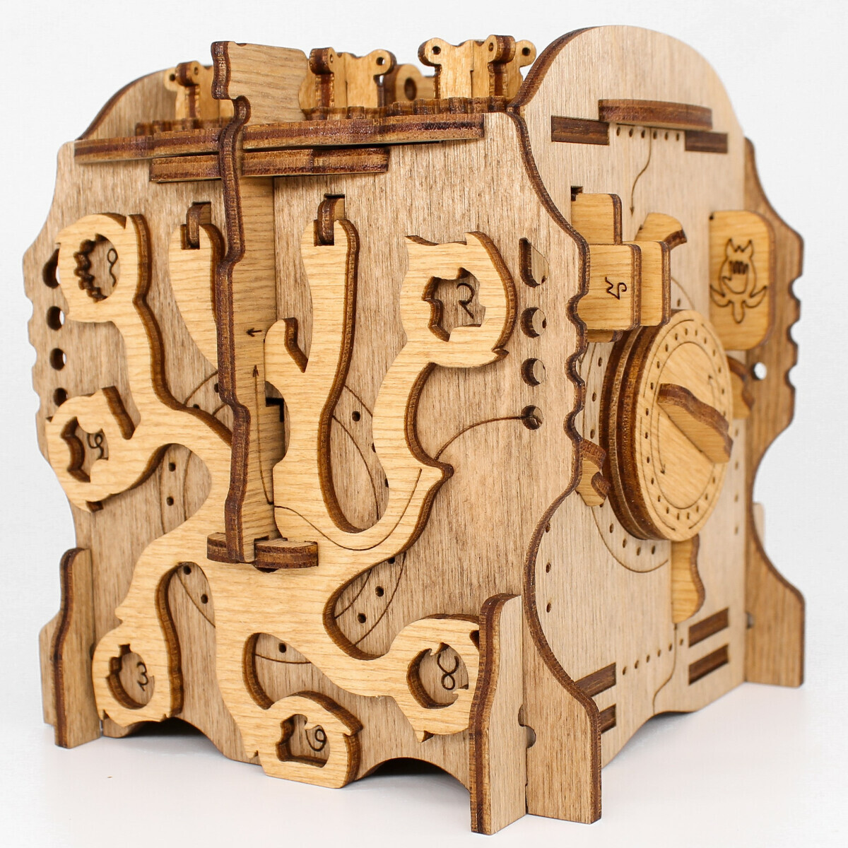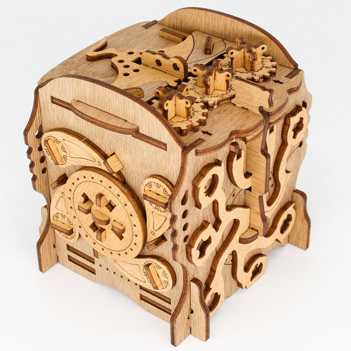 Деревянная головоломка в формате механического квеста. После решения загадок в боксе открывается тайник. Игру можно перезаряжать неограниченное кол-во раз и использовать как необычную подарочную упаковку.