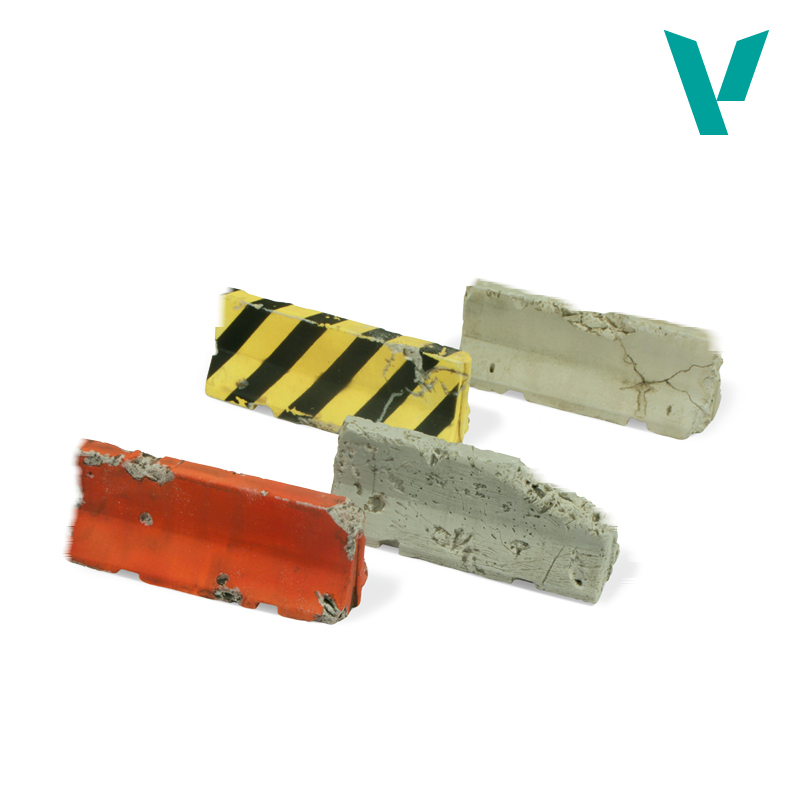 Набор из четырёх повреждённых бетонных барьеров типа «New Jersey» современного дизайна, с имитацией сколов, трещин и следов ударов. Отлично подходит для оформления диорам и сцен.