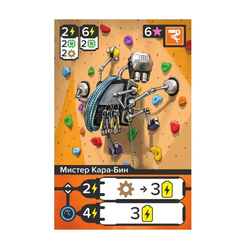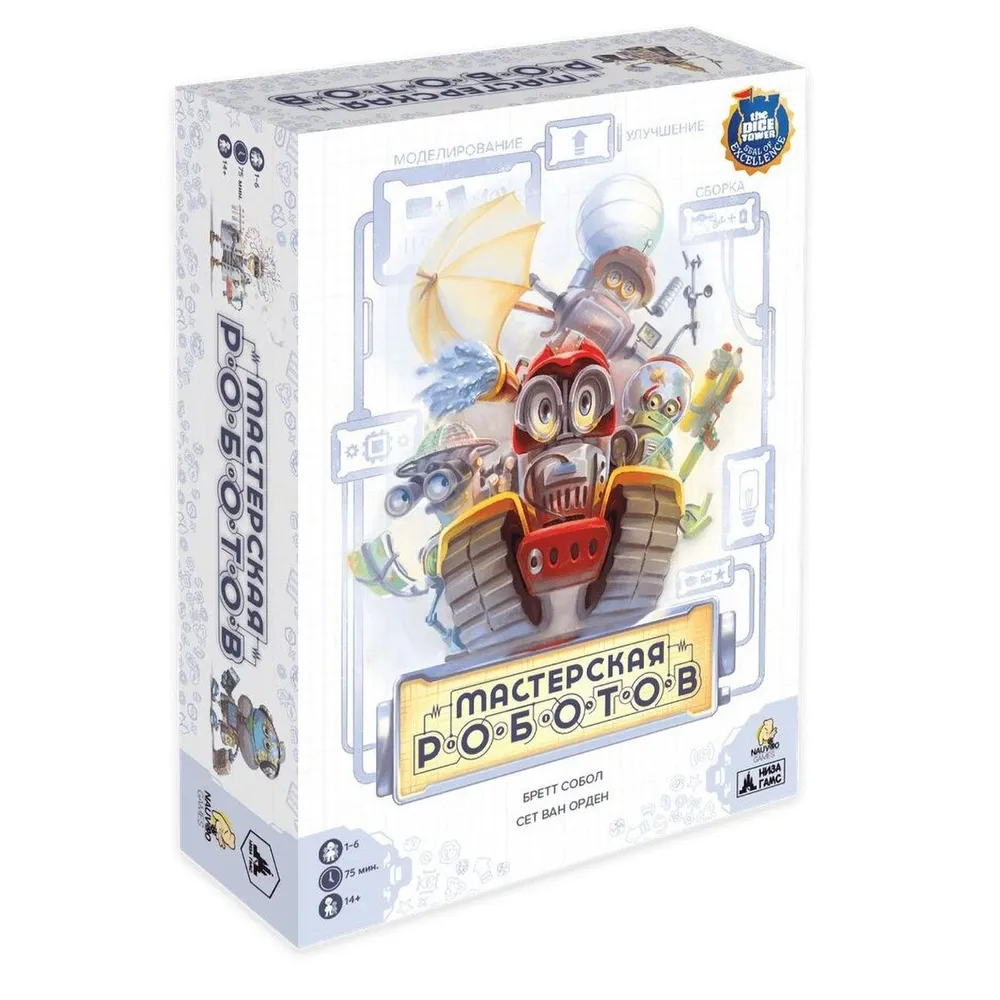 В настольной игре «Мастерская Роботов» вы – известный изобретатель, стремящийся собрать самую большую коллекцию роботов. В каждом раунде вы одновременно выбираете и выполняете два или более действий: модернизировать, собирать, проектировать, изготавливать, перерабатывать. Каждое действие будет выполняться с переменным количеством силы, чтобы сделать действие лучше или хуже. Однако самые мощные действия также помогут вашим противникам.