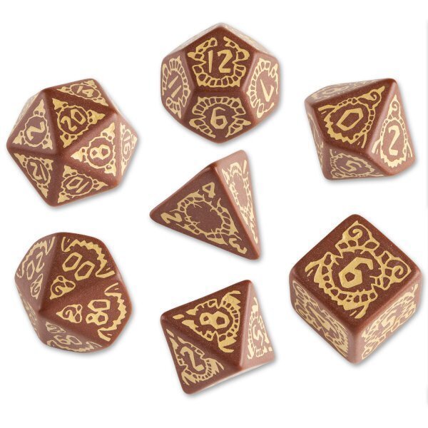 Pathfinder Giantslayer Dice Set – это семь коричневых кубов с тематическим орнаментам элемента земля бежевого цвета и уникальными очертаниями цифр.