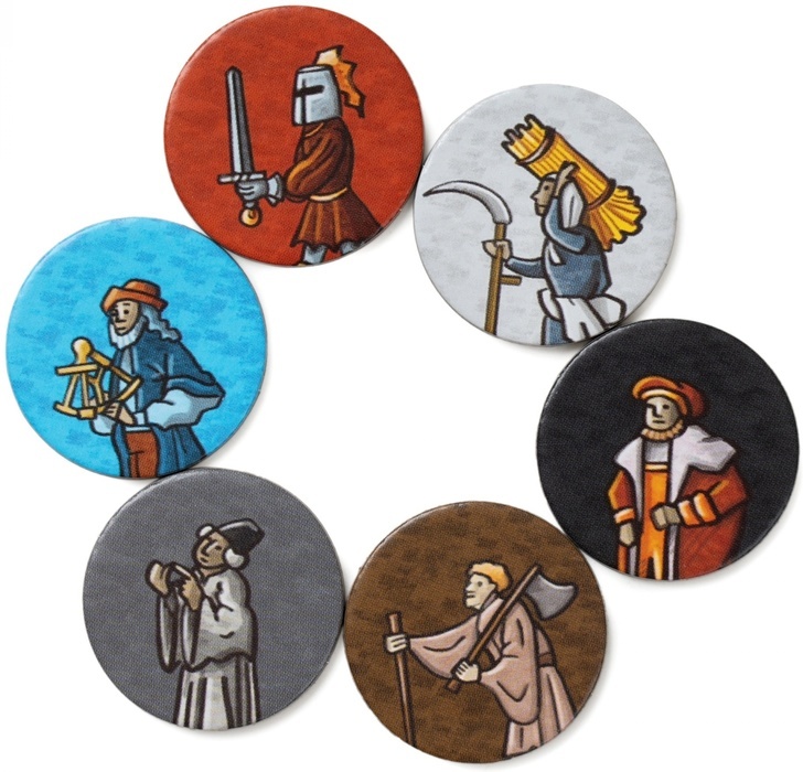 Жетоны подданных будут хорошо знакомы тем, кто играл в Орлеан — их основные области применения остались без изменений. Фермеры трудятся в полях и приносят ресурсы. Рыцари и моряки расширяют вашу зону влияния в окрестностях Орлеана. Ремесленники строят торговые посты (фактории). С помощью торговцев вы приобретаете новые места с улучшенными действиями. Учёные продвигают вас по крайне важной шкале развития. А монахи по-прежнему выступают в роли джокеров, заменяющих любого подданного.