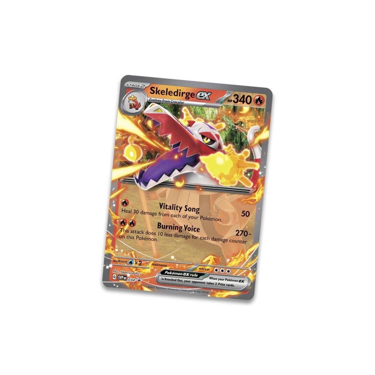 Добейтесь впечатляющего результата на поле боя с полностью эфолюционировавшим Покемоном-партнером поколения ex! Этот набор даст в ваше распоряжение огненную песню Skeledirge ex. А во входящих в состав набора бустерах вы найдете еще больше Покемонов!