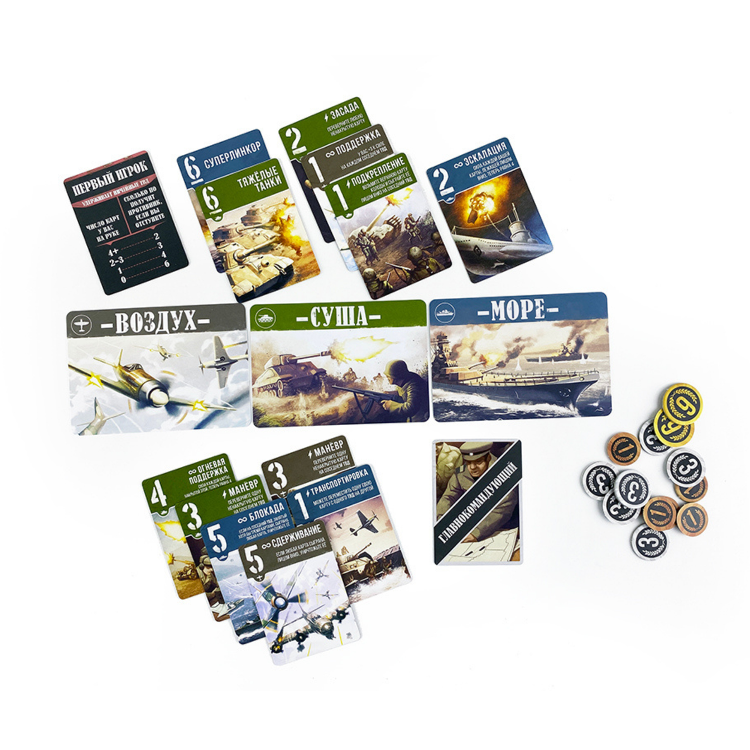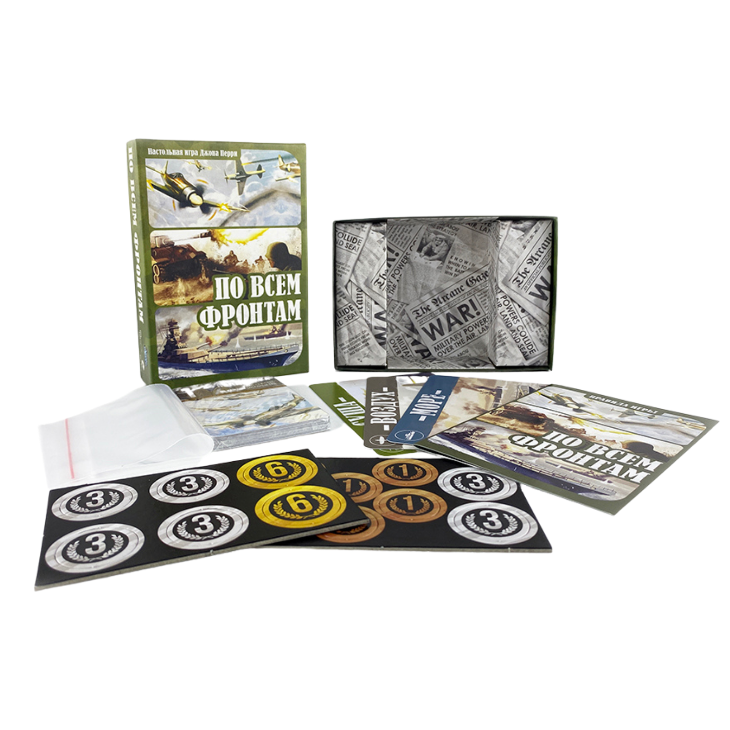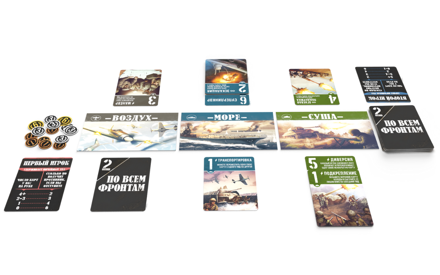 Настольная игра «По всем фронтам» – это компактная и быстрая дуэльная настольная игра о сражениях на всех фронтах Второй Мировой войны. В ней игрокам предстоит сражаться на суше, море и в воздухе, чтобы одержать победу в крупнейшем конфликте в истории человечества.
