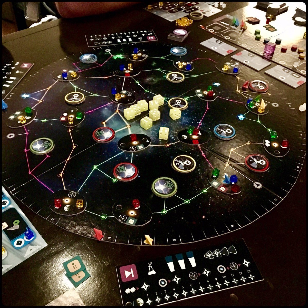 В течении партии в настольную игру Pulsar 2849 игроки будут всячески расширять зоны влияния их корпораций. Вам требуется строить в космосе исполинские мегасооружения, чтобы выкачивать энергию пульсаров. В настольной игре Pulsar 2849 ваш главный хлеб - это гиродинамические генераторы, которые вращаются на орбите пульсаов и осуществляют мгновенную передачу энергии на гигантские межзвездные расстояния. Стройте сети передатчиков энергии и снабжайте звездной энергией открытые вашими исследователями отдаленные планеты. Создайте свою межзвездную корпорацибю вместе с настольной игрой Pulsar 2849!