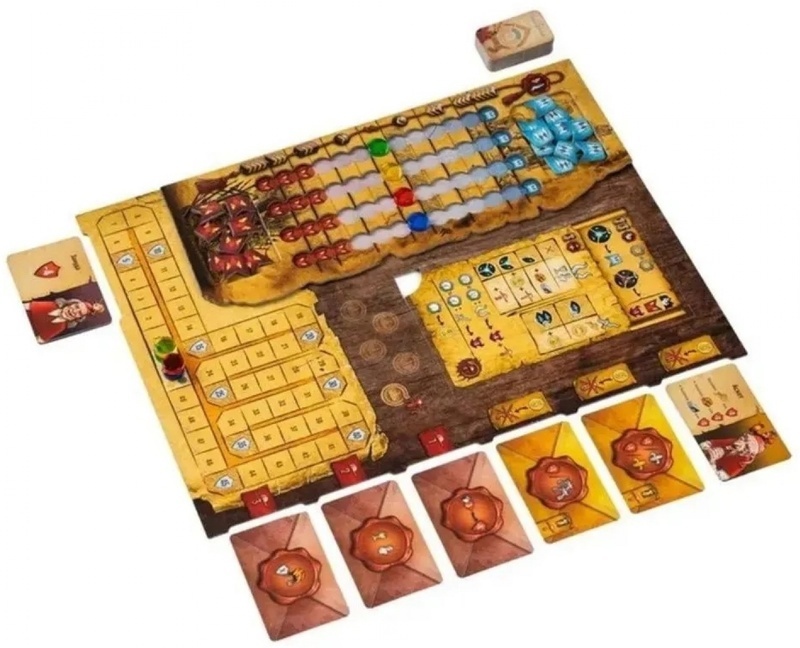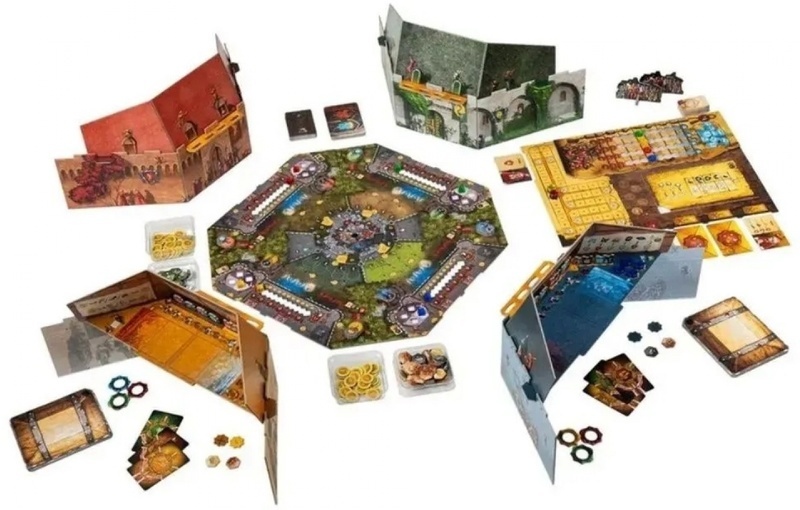 Компоненты в игре просто потрясающие! В центре основного поля необычной формы расположилось вращающееся колесо производства, которое напомнит вам о порядке игровых фаз. Впечатляют сборные двухъярусные ширмы игроков в виде крепостных стен с черепичной съёмной крышей, прорезями для жетонов и удобной памяткой внутри, а также личные сундучки с раздвижными крышками. Иллюстрации на картах своими мелкими деталями и гротескным стилем рисовки напоминают средневековые книжные миниатюры.