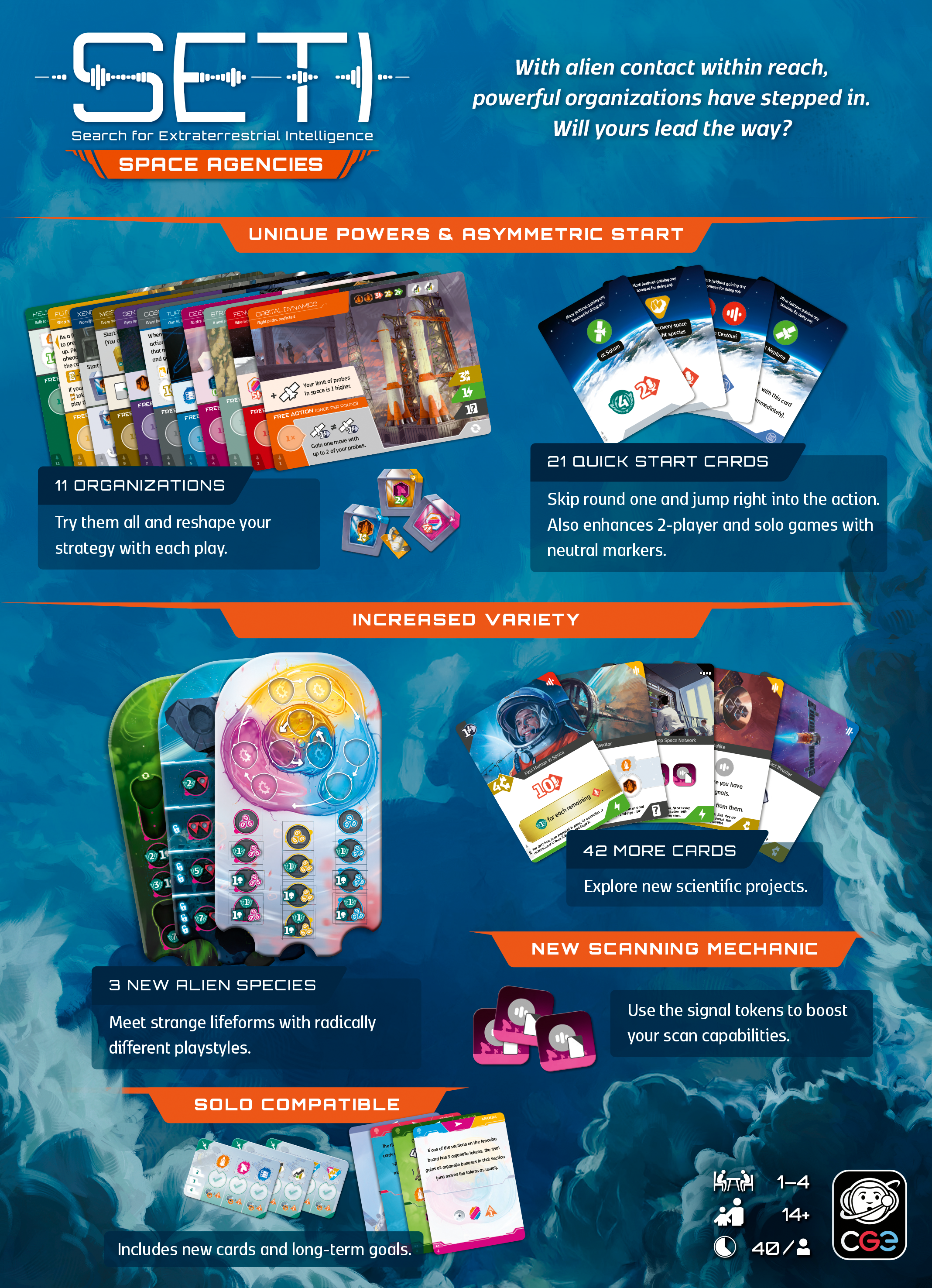 SETI: Space Agencies - это дополнение к настольной игре SETI: Search for Extraterrestrial Intelligence, которое добавляет в игру асимметричные организации с уникальными способностями, стартовыми условиями и стратегическими преимуществами. Каждая организация меняет подход к партии и открывает новые варианты развития.