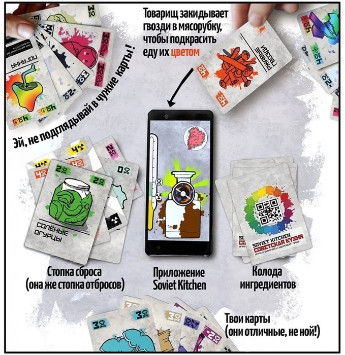 Soviet kitchen (Советская Кухня) – это карточная игра с приложением для iOS / Android, где вы сканируете карты ингредиентов, забросывая их в мясорубку на экране вашего смартфона!Ваша задача – получать из самых странных ингредиентов блюдо подходящего цвета. Вас ждёт Режим Кампании из 22 миссий, а также несколько вариантов игры в Режиме Испытаний, включая колодостроительный вариант игры (для опытных игроков). Правила можно не читать: приложение само всё подскажет прямо по ходу игры!