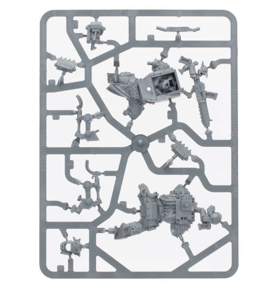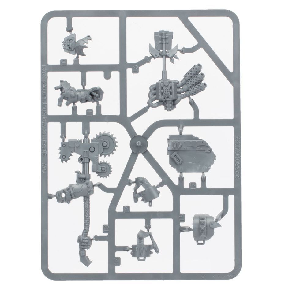 В наборе 17 пластиковых деталей и круглая подставка диаметром 50мм. Из них собирается Босс в Мега-Броне (Warboss in Mega Armour).