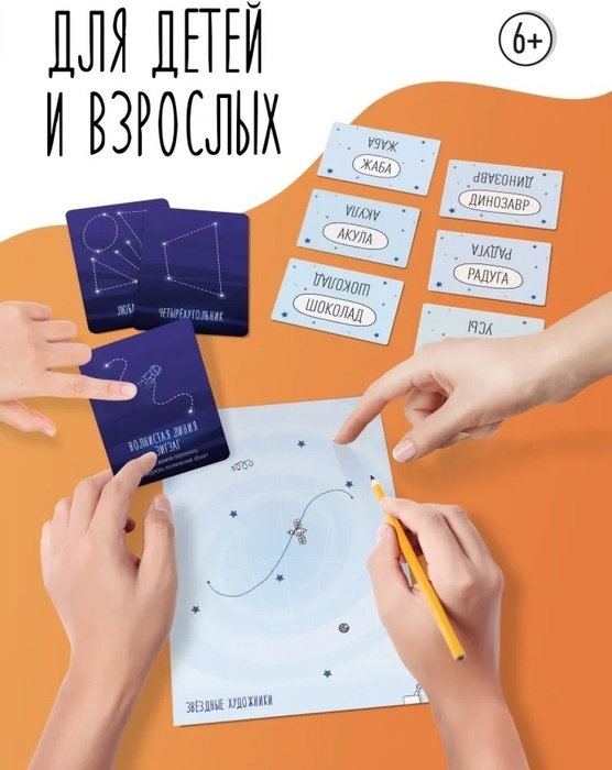 Игроки сообща вместе рисуют загаданное созвездие так, чтобы его смог отгадать ведущий. Но у каждого свои инструменты рисования – кто-то рисует только круг, а кто-то треугольник. На что же будет похоже ваше созвездие?